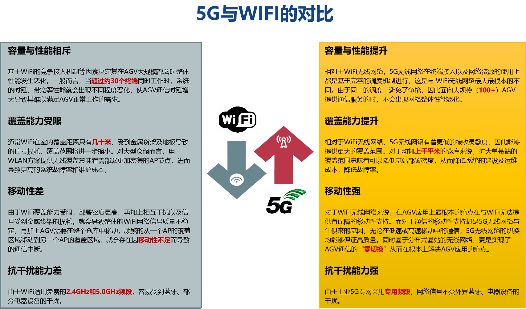 传统自动化仓储方案中,AGV、AMR、机械臂、智能叉车等设备通过WIFI与控制/运维系统连接通信。受制于WIFI技术的缺陷,现有设备存在通信易受干扰、易掉线等一系列问题,具体表现为密集货品、金属货架对信号的遮挡,设备在移动过程中由于数据丢包引发失联,多设备协同的时延抖动,以及无法承载大规模AGV部署等。以上问题导致系统无法稳定运行,常需人工干预,不仅影响生产效率,严重时还会出现碰撞侧翻等生产事故。
