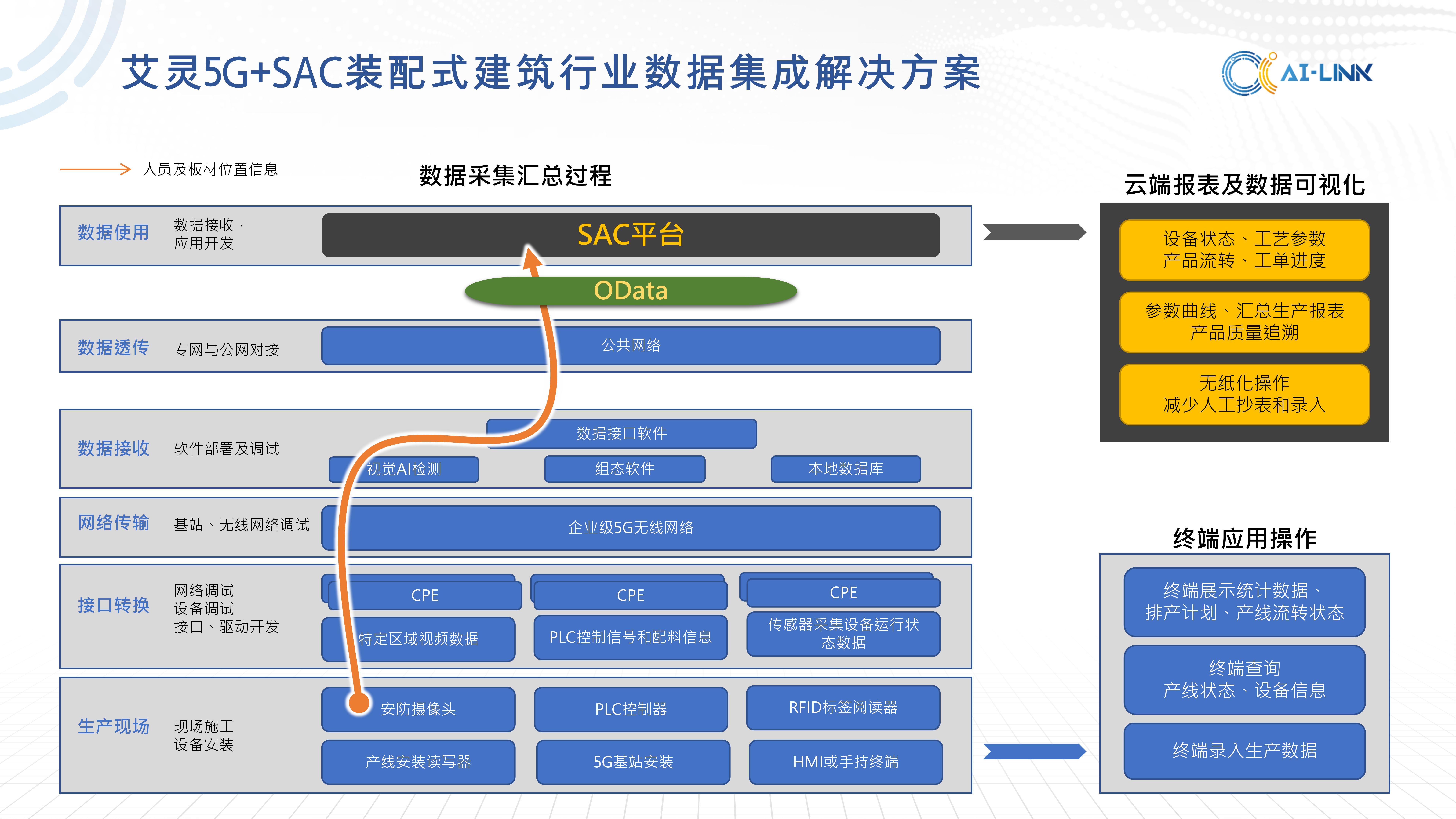 艾灵联合SAP共同打造了基于Local 5G的云端数据集成解决方案,生产现场以Local 5G结合工业视觉AI实现产线全流程不间断监控,通过对接客户侧MES获取数据,再以OData接口将数据送达SAC(SAP Analytics Cloud),实现基于SAC平台能力的现场数据分析,从而优化精益生产管理。