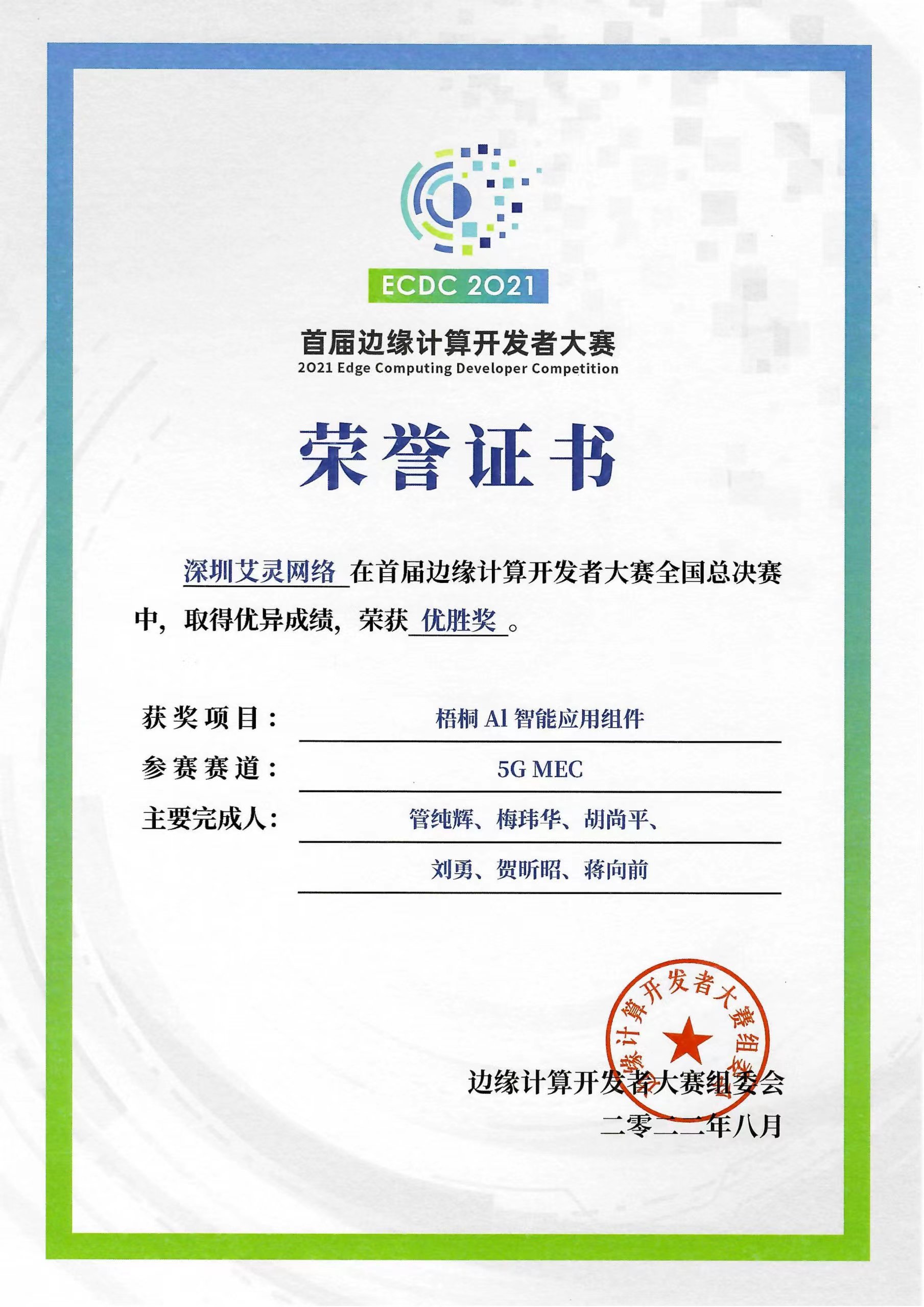 2022 年 9 月 1 日,首届边缘计算开发者大赛颁奖仪式在北京隆重举行。艾灵参赛团队(艾灵-湖南省联通-中电互联战队)历经层层筛选,从来自全国各地120家机构的近500支参赛队伍中脱颖而出,凭借申报项目“梧桐AI智能应用组件”,荣获首届边缘计算开发者大赛全国总决赛优胜奖,受到产业各方高度关注。