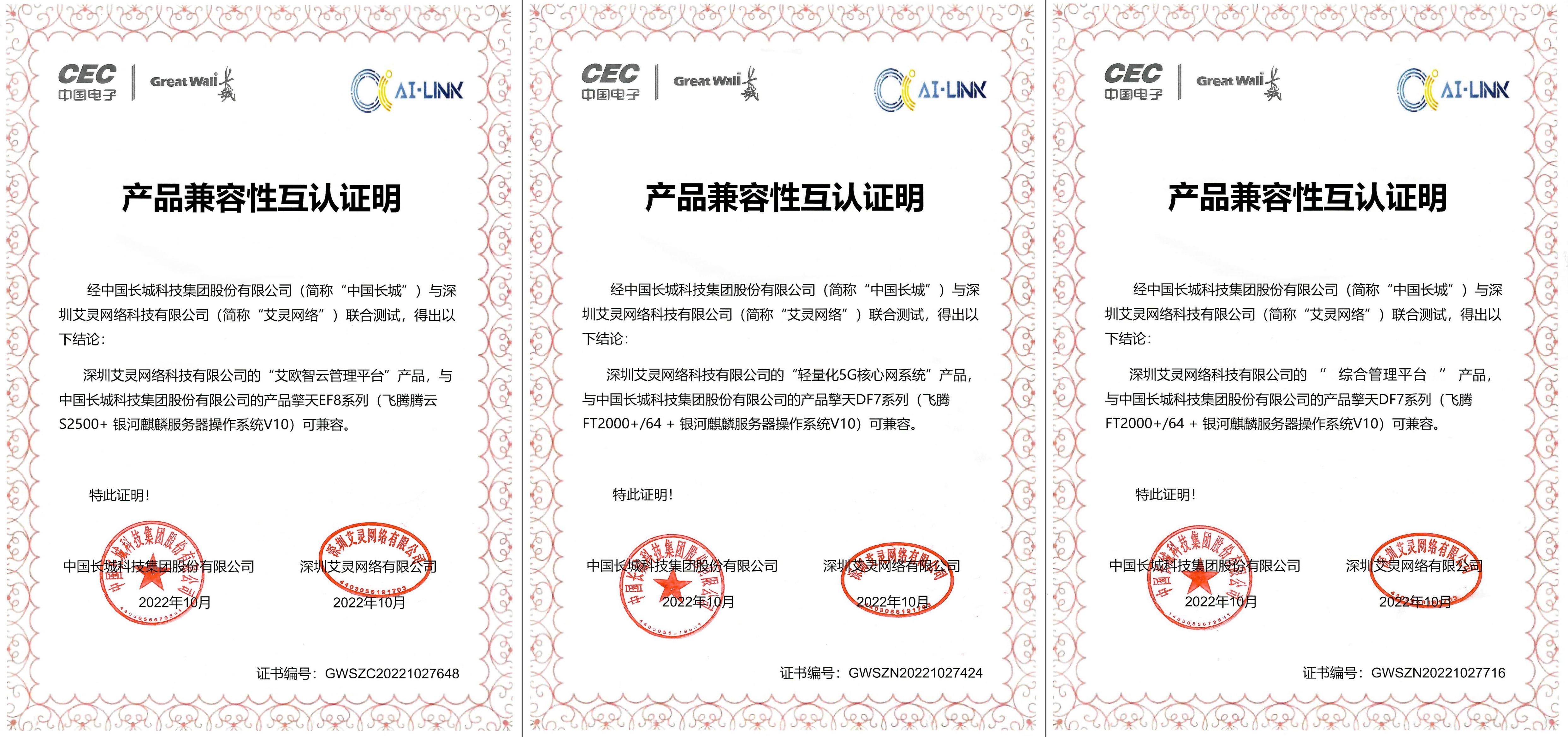 中国长城、中电联合创新研究院对艾灵三款产品的功能、性能、稳定性、兼容性、可靠性等进行了系统性验证。经验证,「艾欧智云管理平台」在飞腾腾云S2500服务器与银河麒麟V10操作系统版本的验证环境中稳定运行;「轻量化5G核心网系统」、「综合管理平台」在飞腾FT2000服务器与银河麒麟V10操作系统版本的验证环境中稳定运行。艾灵三款送测产品全部符合PKS体系兼容性要求,顺利通过PKS体系认证。