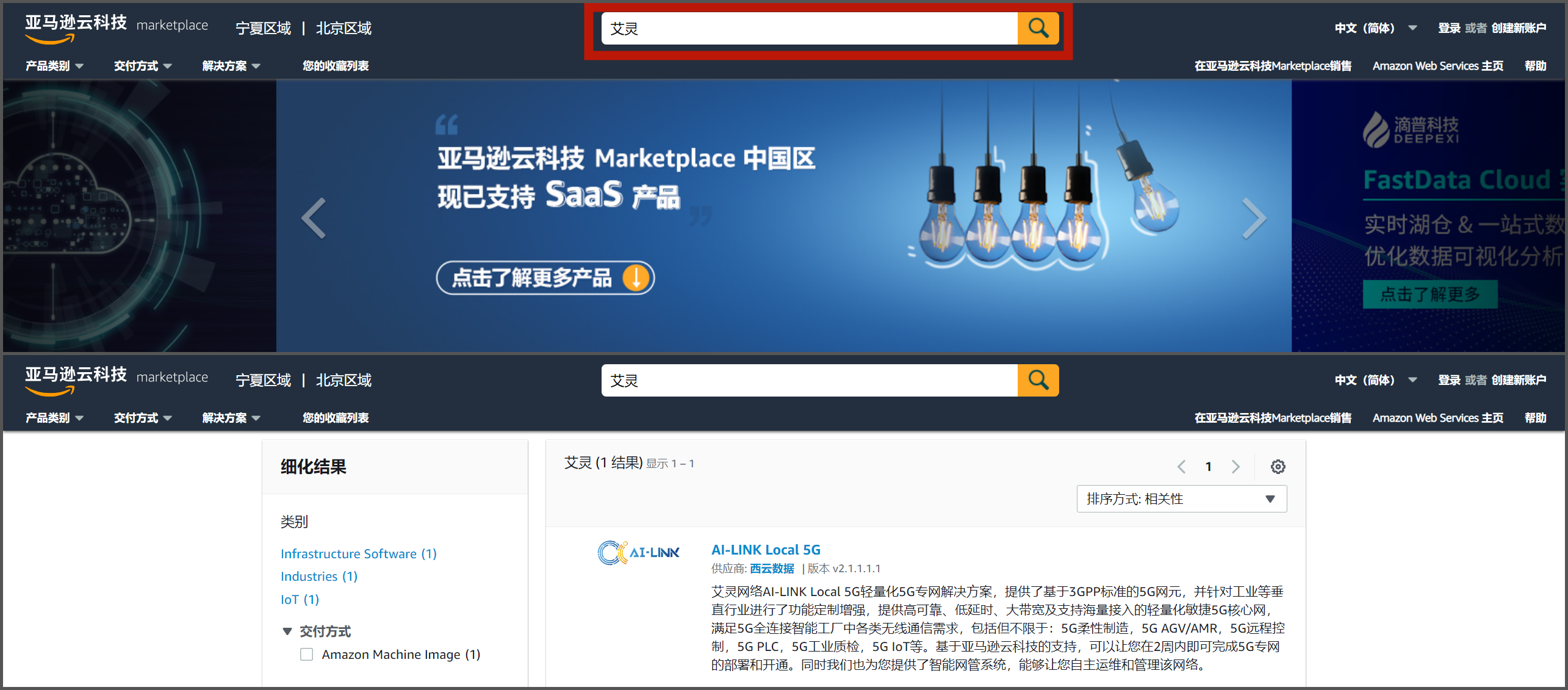打开亚马逊云科技Marketplace,在页面顶部搜索栏搜索“艾灵”,即可查看艾灵最新上线产品。